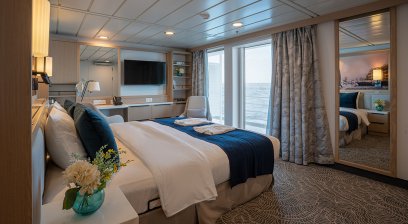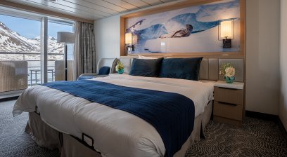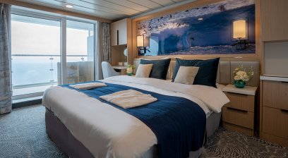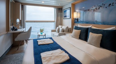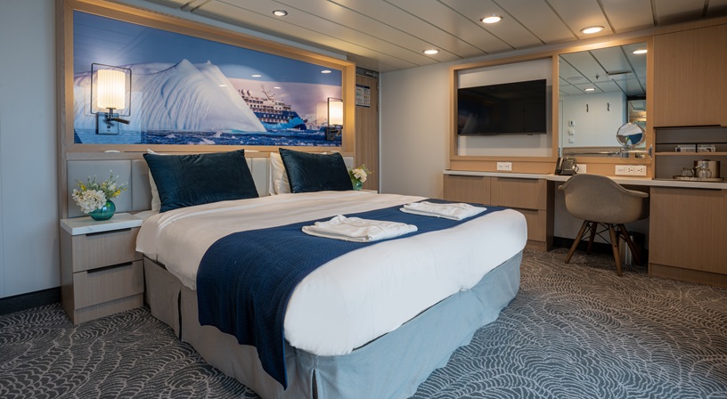 有名なドレーク海峡を横断します。途中、南極からの冷たい海水と大西洋と太平洋、インド洋からの暖かい海水が混じりあう南極収束線を通過します。ドレーク海峡は強い偏西風と荒波で知られていますが、強力なエンジンと横揺れ防止装置を完備した客船は優秀なクルーが操船します。サウスシェトランド諸島が近づくにつれ、南極の氷山が見えてくると徐々に興奮が高まります。天候が良ければ、アザラシやペンギンが泳いでいる姿を目撃するかも知れません。また、この海域ではアルバトロスなどの海鳥が大空を飛翔していることでも有名です。 - 宿泊