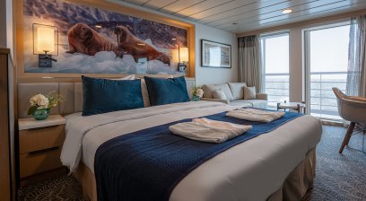 すべての観光は、天候や海象、氷の状況によります。ゾディアッククルーズやカヤックは適切な条件下で実施されます。全てのお客様とスタッフの安全を最優先にご案内いたします。クルーズ中に悪天候のため観光ができない場合には、船内のウェルネス&サウナ、レストラン、バー、図書室などの施設を利用してお楽しみください。この探検クルーズ中、専門家による探検の歴史や生物学、地質学、氷や野生生物などのレクチャーを予定しています。- 宿泊