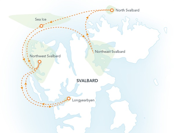 地球上で最も北にある土地の一部、ノールアウストランネ(北東島)と可能であればスヴァールバル諸島の北に位置する7つの小さな島々(9つとも言われている)がある七島群島に到着を予定しています。ここは植生がほとんどない岩の多い島々で、ノルウェー本土にある有名なノールカップから北に約1,000km離れた場所に位置します。