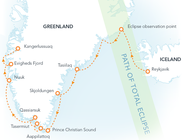 人里離れたこの遠隔の場所で起こる皆既日食は、グリーンランドを東から西へと壮大な探検クルーズの始まりにふさわしいものになります。航海は、アイスランドの首都レイキャビクを出港し、直接日食エリアへ進路をとります。そして驚くべき美しい自然に囲まれてこの驚異の天空自然現象を目の当たりにします。