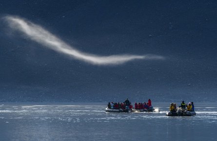 強い潮流により1年中氷が流れる海峡で両側にはそびえる山々に囲まれ水面から高さ2,000mを越える山もあります。大きな氷河が海峡の北側から海に流れ込み、南側からはサファイアブルーの山の氷河が水面に聳え立ち、巨大な氷山が海面に点在しています。
