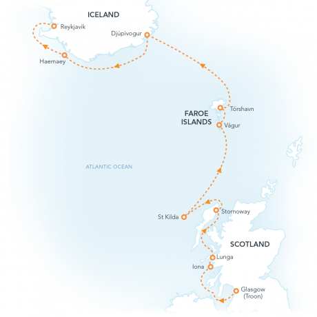 絵のように美しいトルーンの町(グラスゴー中心部からほど近い海辺の街)を出港し、旅はインナー・ヘブリディーズ諸島へと始まります。聖なるアイオナ島では、古代ケルト・キリスト教の息づく遺産に触れ、その後はスコットランド・ゲール文化の中心地ストーノウェーへ。さらに、地図の縁を越えるようにして、孤高のセント・キルダへと進みます。ここは「英国で最も辺境の群島」にして、ユネスコ世界遺産に自然・文化の両面で二重登録された唯一の場所。その後、荒々しくも荘厳なフェロー諸島で2日間を過ごします。めったに訪れられない北大西洋の秘境です。旅はさらに続き、ノルウェー人探検家たちの足跡をたどりながらアイスランド南岸を航海。
