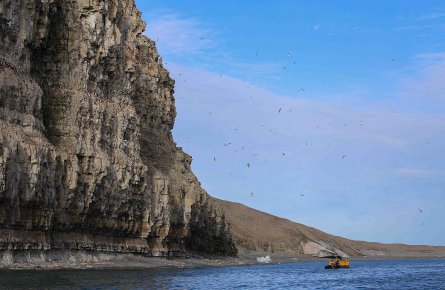また、無人島のプリンスレオポルド島の海岸も、コースの見どころのひとつです。重要な渡り鳥の保護区であり、重要鳥類生息地として知られています。ゾディアックボートで崖のふもとを回り、営巣する鳥たちのそばを通る迫力のクルーズが楽しめます。夏には、数十万羽の海鳥が急峻な崖に繁殖しており、ハシブトウミガラスやフルマカモメ、ハジロウミバトなどを間近で観察することができます。