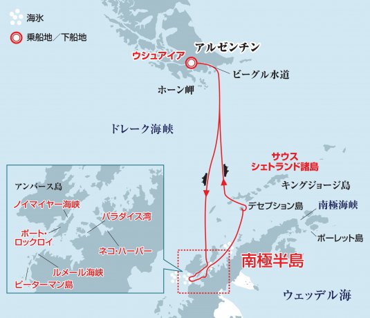 旅程はすべて目安です。プログラムは氷、天候、野生生物の状況により変更される場合があります。上陸はIAATO規制に基づき、観光ポイントの状況、許可、環境への配慮に応じて行われます。正式な航海計画と上陸はシーズン開始前にIAATOと調整しますが、最終的な旅程はエクスペディションリーダーが決定します。探検クルーズでは柔軟性が最も重要です。当社の船の平均巡航速度は10.5ノットです。