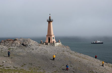 朝、小さなコリューチン島に錨をおろします。氷が後退する一定期間、セイウチの集団営巣地がこの島の海岸にできます。