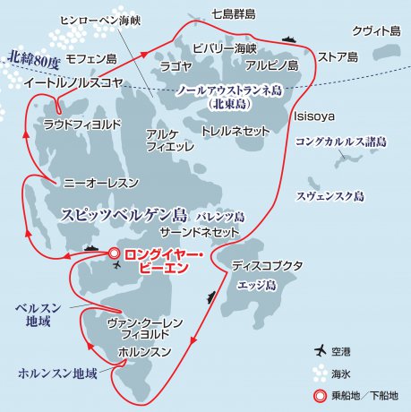スヴァールバル諸島を一周できる可能性は、1992年~2019年の経験に基づき、7月前半:約30%、7月後半:約70%、8月前半:約90%、8月後半:約95%です。万が一、スヴァールバル諸島一周ができない場合、スピッツベルゲン島の北東部または南東部でのプログラムを計画する場合があります。