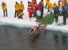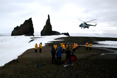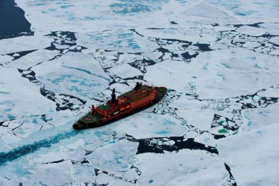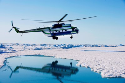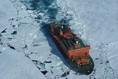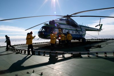 ●50イヤーズ・オブ・ヴィクトリーが氷に覆われた北極の海をダイナミックに割りながら進む様子をヘリコプターで上空から見学します。