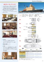 Kapitan Khlebnikov 船尾船首● 改装年 : 1992~93年 ● 総トン数 : 12,288トン ● 航海速力(開水域) : 15ノット● アイスクラス : KM★LL3 A2 ● 乗組員 : 70名 ● 乗客定員 : 108名● 搭載ヘリコプター : 2機 ● ディーゼル・ エンジン : 24,000馬力● 全長 : 122.5m ● 全幅 : 26.5m ● 喫水 : 8.5m ● 船籍 : ロシア■主な施設ダイニングルーム(お食事は1回制の自由席)オーディトリアム(レクチャールーム)、エレベーター(1基)、クリニック、ショップ、図書室、室内プール、サウナ、ラウンジ■客室の主な設備 バスローブ、ヘアードライヤー■その他レストランとバーの営業時間にはアルコール飲料及びソフトドリンクを無料でお楽しみいただけます。ラウンジには24時間いつでも自由にコーヒーや紅茶、ココア、飲料水がコーヒーステーションも用意されています。衛星回線電話、E-メール客室の一例/イメージダイニングルーム/イメージ図書室/イメージレクチャールーム/イメージツインコーナースイートトリプルスイートシップデータ事務室(オフィス)船長室通信室ブリッジレクチャールーム(講堂)バーショップラウンジ図書室ダイニングルームヘリコプタージムプールサウナクリニック 2万4千馬力のエンジンを搭載し、45mmの鋼板で船体を覆った世界最強クラスの大型砕氷船です。 通信衛星を利用した衛星航法や気象衛星を利用した流氷予測など、最新のハイテク技術が駆使された実働的なシステムによって、従来の船では到底不可能だった高緯度の氷の海を安全に航行します。 クルーズ中には、ヘリコプターを使っての上陸や遊覧飛行も行います。カピタン・フレブニコフ客室タイプ客室の設備トリプル(3人部屋)窓側(角窓)、トリプルベッド、シャワー付 ※2段ベッド+ソファーベッド窓側(角窓)、ツインベッド、シャワー付窓側(角窓)、ダブルベッド、シャワー付窓側(角窓)、ダブルベッド、シャワー付広さ12.5㎡12.5㎡30㎡30㎡階5、85、6、7、86、76、7ツインスイートコーナー・スイート※ツイン客室のベッドは、シングルベッドとソファーベッドです。※スイート客室のベッドは、1つのダブルベッドです。※コーナー・スイート客室のベッドは、ダブルベッドとソファーベッドです。9階8階7階6階5階4階3階44